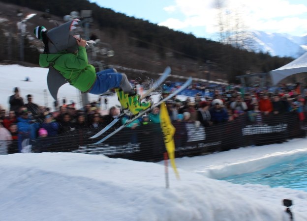 In early April, Girdwood, Alaska hosts the annual Slush Cup.  Several dozen rider-swimmers take turns speeding down the bottom of the ski run toward a ramp.  The ramp launches them over an icy pond.  Alyeska Resort digs the pond just for the event.  A rider technically is successful if he or she can land a jump and water ski across the pond without getting wet.  Riders get extra points for outlandish costumes and tricks or crashes.